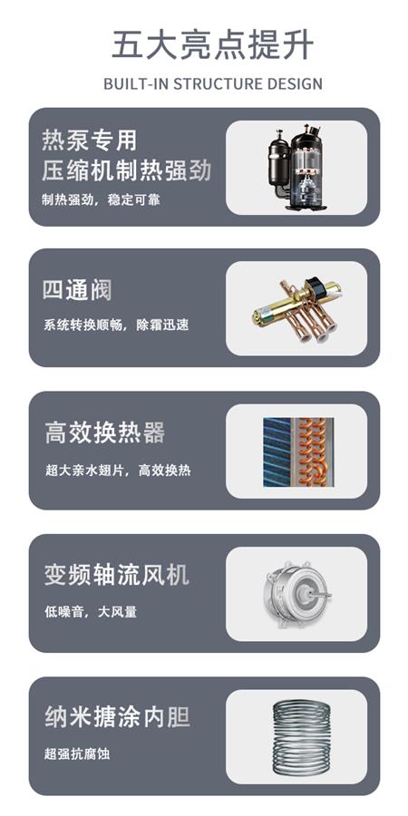②、全天候运行:一年四季不受天气影响,可24小时供应恒温热水,与太阳能系统配套使用,可解决太阳能无法全天候供应热水的缺点。